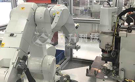 ■ 8工位自动旋铆、压弯、功能测试、打印、机械手自动下线输送综合装配测试设备